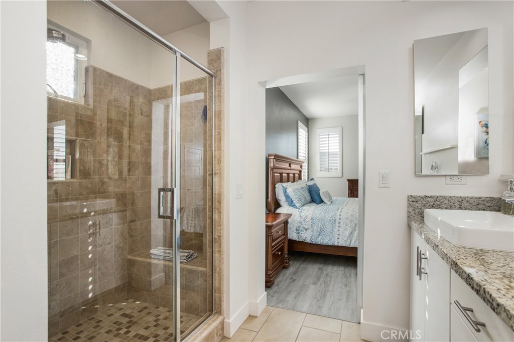 Welcome home to 1 District, a beautifully upgraded end unit home in the Elements at Vantis community which is a mix of natural beauty and soft urban cityscape. The home features an open floor plan, high ceilings, recessed lighting, ceiling fans, plantation shutters, silver oak hardwood floors throughout, and new carpeting on the stairs. The gorgeous kitchen has granite countertops, custom backsplash, a center island with barstool seating, and stainless steel appliances. The spacious living room with a large TV wall and the dining room are open to the kitchen. There is a half bath on this level and a home office area. The covered patio is off of the dining room which is perfect for a barbeque and a couple of chairs to enjoy the sunshine. Upstairs there are two spacious bedrooms each with their own upgraded bathrooms. The primary bedroom has a beautiful ensuite bathroom with granite counters, dual sinks, and a large step in shower. A separate laundry room with space for full size machines is on the upper level. 2 car side-by-side garage is attached with direct access. Enjoy the Vantis lifestyle with luxurious amenities like a gym, billiards room, clubhouse, business center, car washing station, outdoor dining and barbecue areas, and a resort style salt-water, heated pool and spa with covered cabanas. Within walking distance, you will find dining, shopping, and entertainment at the Aliso Viejo Town Center. The Vantis area is slated for excellent schools within the Capistrano school district.